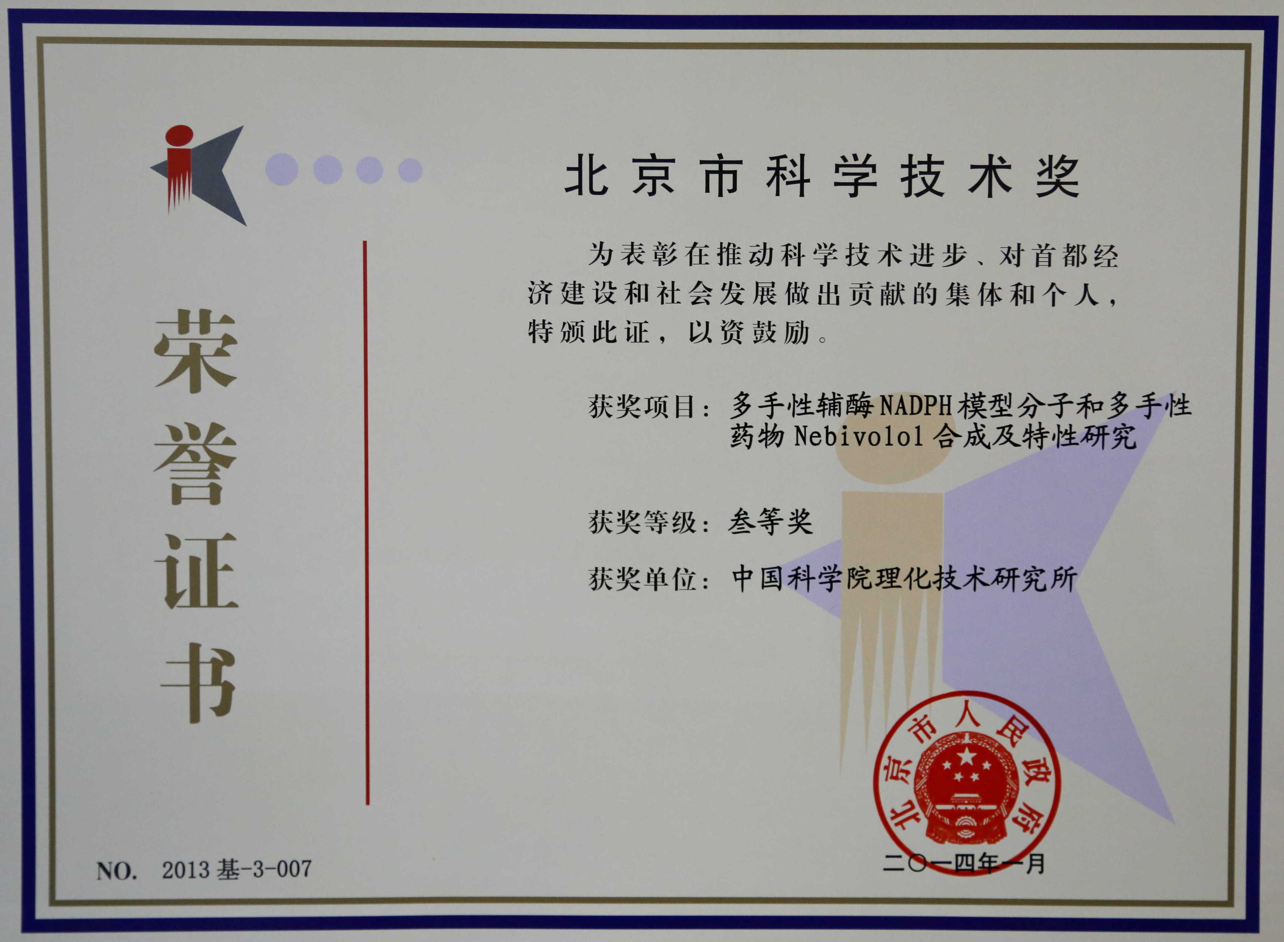 北京市科学技术奖三等奖(2013)——多手性辅酶NADPH模型分子和多手性药物Nebivolol合成及特性研究