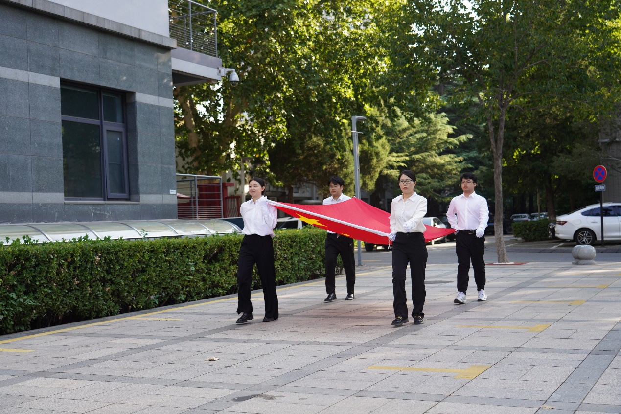 在雄壮激昂的进行曲中,护旗手纪鑫、王秀朋、邱劲淞和白林同志迈着整齐有力的步伐,护送五星红旗入场,并将国旗庄重的交到升旗手祁超和王越同志手中。伴随着《义勇军进行曲》的响起,在场全体人员肃立致敬,高唱国歌,向冉冉升起的五星红旗行注目礼。鲜艳的国旗在理化所上空高高飘扬,熠熠生辉。