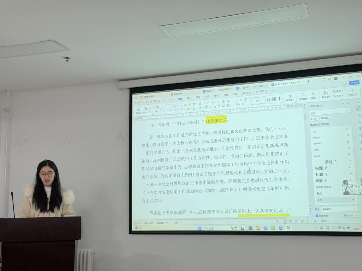 接着,王桂丽为大家讲解了《中国共产党思想政治工作条例》的基本精神、基本内容、基本要求,并号召全体党员充分发挥思想政治工作的引领作用,用党的创新理论武装头脑、统一思想、凝聚共识、指导实践,为强国建设、民族复兴伟业提供坚强思想政治保证。