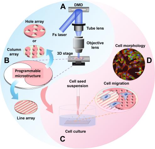 生物材料表面的微观形态特征对细胞增殖、黏附和分化至关重要。然而,表面特性调控细胞行为的具体机制仍不明确,目前用于细胞调控的表面设计往往过于单一,难以同时满足高精度制造与结构多功能性的双重要求。飞秒激光无掩模光学投影光刻技术(Fs-MOPL)采用数字微镜器件(DMD)作为掩模板,可以快速制造高精度大面积的可编程细胞芯片,实现对细胞浸润性的调控。