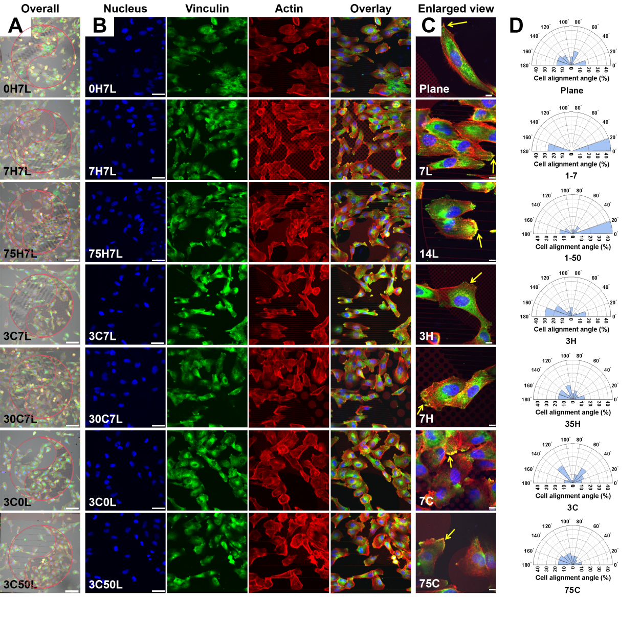 研究人员利用飞秒激光无掩模光学投影光刻AZ P4620光刻胶制备的芯片结构展现出高结构保真度和均匀性。通过O2等离子体和PDL涂覆等表面处理工艺,显著提升亲水性,促进细胞黏附与增殖。通过免疫荧光染色和共聚焦显微镜观察,可编程细胞培养芯片结构对786-O细胞的迁移、黏附及形态变化具有定向调控能力。细胞对线间距、柱直径和孔径等结构参数的变化表现出明显响应差异。值得注意的是,在线阵列结构上培养的细胞呈现拉长形态并形成排列整齐的肌动蛋白应力纤维,而柱阵列和孔阵列对黏着斑分布有显著影响。生物相容性验证证实该可编程细胞培养芯片适用于细胞培养和组织工程应用。