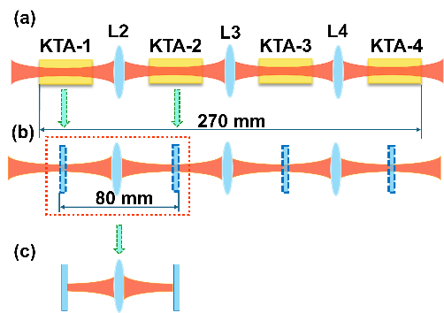 该方案的核心思想是:用一个精心排布的、由数块非线性晶体组成的紧凑周期阵列,来代替原本庞大而精密的谐振腔。光脉冲不再需要在长达数米的谐振腔内循环往复来实现光脉冲同步以获得能量增益,而是在这个仅有几十厘米长的晶体阵列中高效地模式自再现并放大数次,即可实现“自同步泵浦”的高效率高光束质量参量转换。通过精确设计晶体和透镜的位置,使得参量光模式在每次通过晶体后能够“自再现”,并保持泵浦光与参量光良好的模式匹配,从而模拟了谐振腔的模式筛选和放大功能,但摆脱了SPOPO对腔长的限制。