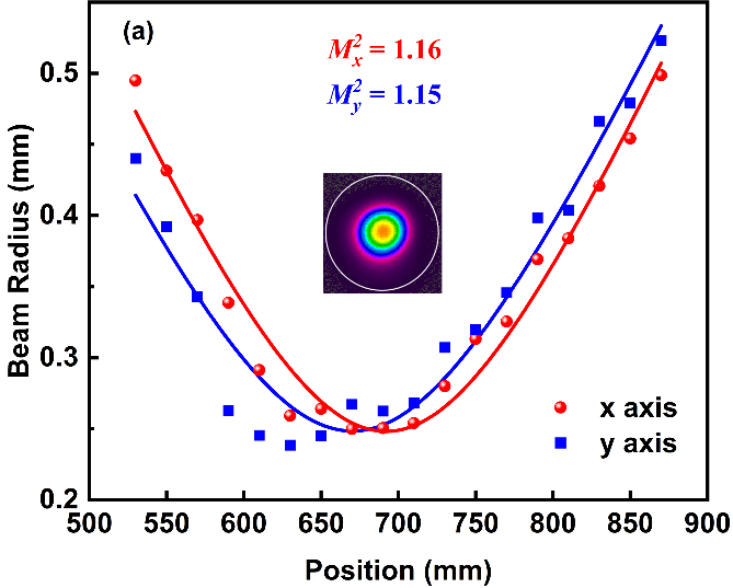 1.5μm信号光光束质量拟合曲线图。插图:信号光的二维光斑图