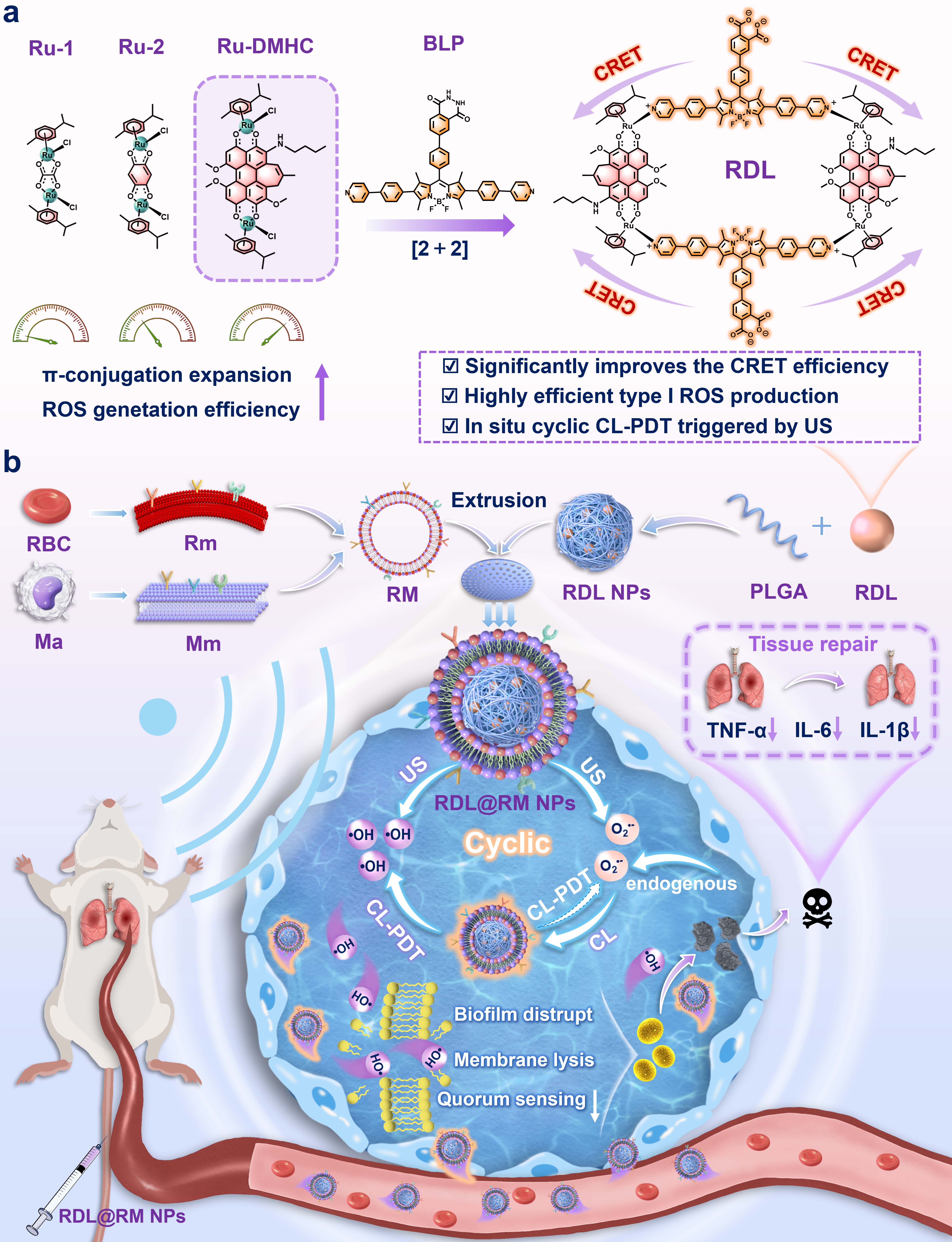 1 aRDL设计的示意图;(bRDL@RM NPs的制备及对急性耐甲氧西林金黄色葡萄球菌肺炎的治疗示意图