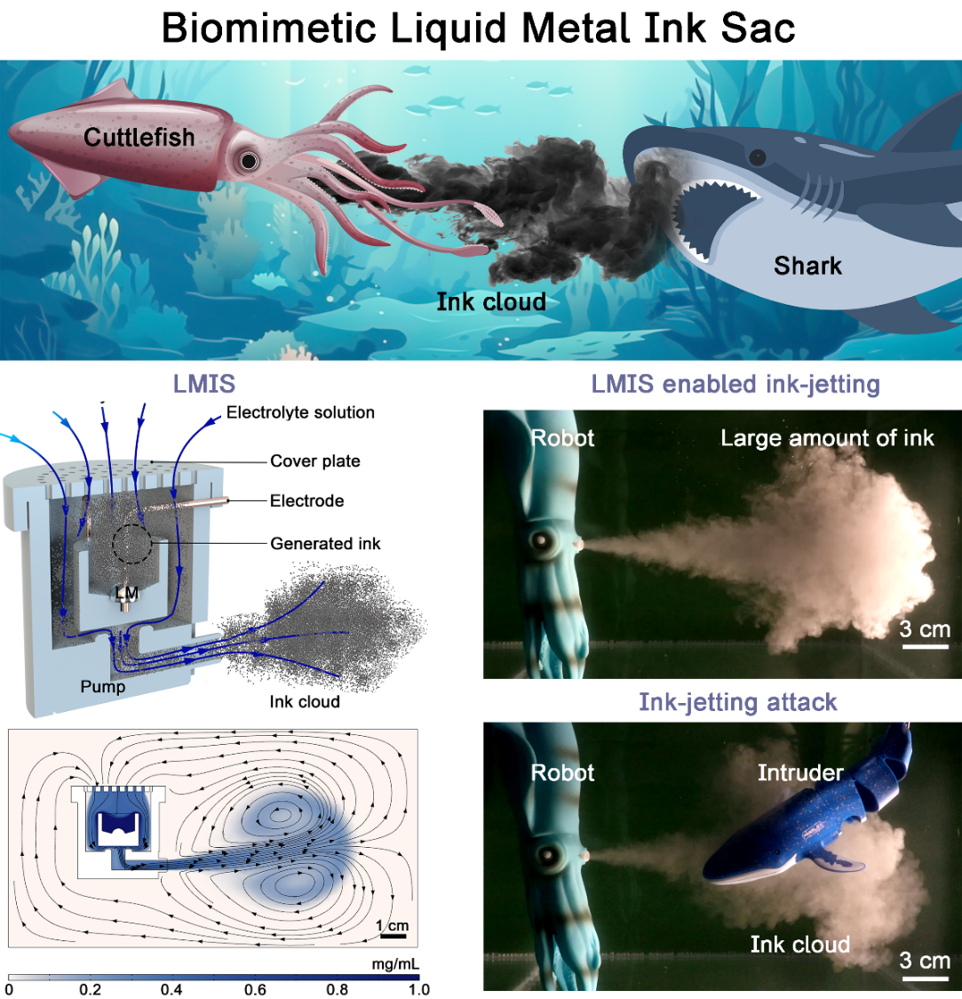 当液态金属与海洋生物相遇时,也呈现出奇妙的场景。众所周知,在幽暗而广袤的海底世界,有着一群身怀绝技的水生动物,如乌贼、章鱼和鱿鱼等在遭遇危险和捕食者时,能瞬间喷出一团浓墨,趁势遁逃——这一与生俱来的“神奇本领”,堪称自然界最为经典的防御策略之一。然而,人类迄今虽已成功模仿了鱼类的游动姿态、章鱼的灵巧触手,以及多种感知、通讯与智能行为,却很少能复现这种炫酷的“喷墨逃生”绝技。如今,这一仿生学与机器人领域的空白也获得新突破。