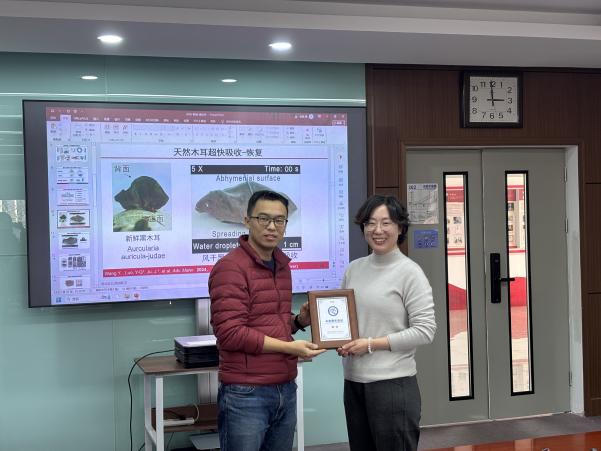 鞠婕教授长期深耕结构驱动的液体输运调控领域,聚焦从机理研究到实际应用的全链条探索,尤其关注液体超快速吸收及超大面积铺展技术,致力于开发超浸润材料在热管理、能源转换、水处理及生物监测等关键领域的应用价值。报告中,鞠婕教授指出,具备快速、定向液体吸收运输功能的多孔材料在一次性卫生用品、伤口敷料、热湿调节服装等民生领域具有巨大应用前景。鞠婕教授针对当前该领域的研究现状进行了介绍,指出沿多孔材料垂直方向构建化学润湿梯度、结构梯度或两者结合是实现该功能的常见技术路径。受天然木耳快速吸液现象启发,其研究团队发现木耳柔毛面最上层为微米尺寸的阵列结构,下层为微米/纳米多孔复合结构,这一独特结构可显著加速液体吸收,相比无绒毛的多孔结构吸收时间缩短2个数量级。该发现为超快、定向、无反渗液体吸收织物的构建提供了全新的理论支撑和创新实验手段,为相关产业技术升级注入新动能。