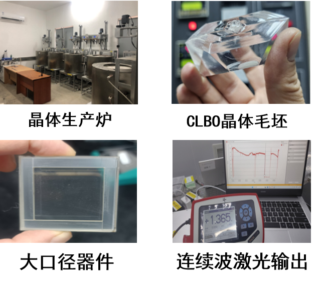目前,晶体中心研发出抗潮解CLBO晶体生长工艺及无水加工工艺,进行了266nm连续波激光输出实验,激光功率达到了1.378W,稳定输出超过1000个小时,完全满足实用化需求。大尺寸CLBO晶体正在加速研制中,2024年已成功生长出852克的CLBO晶体,获取了30mm×30mm×3.7mm尺寸的无缺陷晶体器件,已交付用户进行激光实验。后续研究工作重点是进一步降低晶体吸收系数,提高晶体损伤阈值,实现10瓦级266nm和40W级355nm激光输出,以及进行相关的工程化研究。