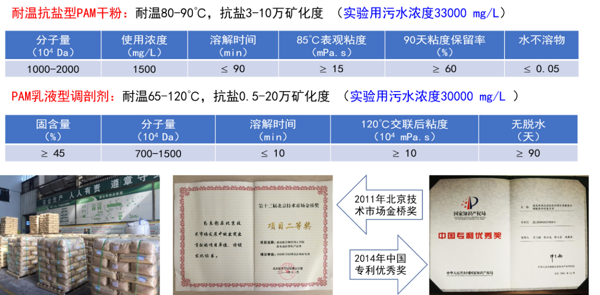 项目介绍:聚合物驱是最有效的三采技术,但现有聚合物驱最大的难点是要解决聚合物在高温高盐地质条件下的长期稳定性问题以及聚合物水溶液的表观粘度和注入性之间的矛盾。目前,大部分的产品都片面地追求聚合物水溶液的表观粘度,而忽视了其他方面的性能,因此在实际应用中达不到预期的效果。理化所针对高温高盐油藏的特点,通过分子结构设计,选用特定的功能单体,并通过先进的技术控制单体在聚合物分子链上的微观序列结构,先后研发了胜利油田二型及三型、河南油田二型及三型、大庆油田三类油藏适用的耐温抗盐驱油聚丙烯酰胺干粉型产品,均实现了工业生产,产品已广泛进入国内外市场。目前,最新一代产品可应用于温度85℃、矿化度5万、渗透率低于50毫达西的油藏,可以满足大部分苛刻油藏的驱替要求。